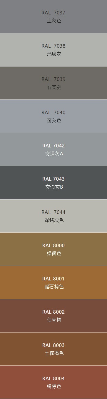 什么是RAL色卡?自從1927年,當(dāng)RAL涉入色彩時(shí),就創(chuàng)建了一種統(tǒng)一的語言,為豐富多彩的顏色建立標(biāo)準(zhǔn)統(tǒng)計(jì)和命名,這些標(biāo)準(zhǔn)在世界范圍內(nèi)被廣泛的理解和應(yīng)用。 4位數(shù)的RAL顏色作為顏色標(biāo)準(zhǔn)已達(dá)70年之久,至今為止已發(fā)展到200多種。無光澤的顏色基礎(chǔ)色卡為RAL-840HR,有光澤的為841-GL,這些顏色基本色塊滿足了大范圍的應(yīng)用,已被許多重要公司及研究機(jī)構(gòu)所使用。RAL-840HR及RAL-841GL 顏色注冊(cè)都作為顏色樣本應(yīng)用于設(shè)計(jì)中,同時(shí)它們也包括了安全和信號(hào)色符合DIN及ISO規(guī)定的顏色要求。